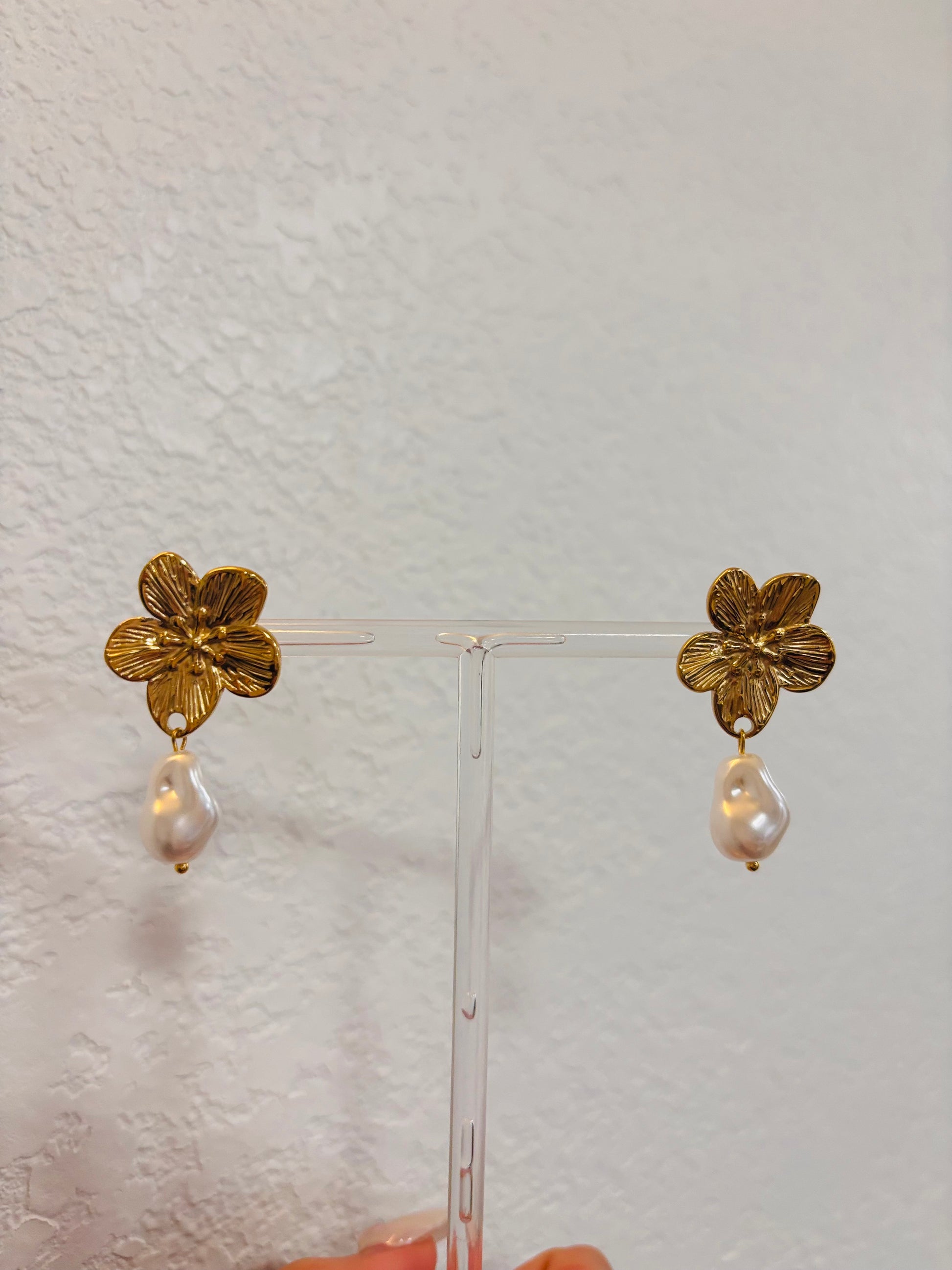 Arete en oro stainless steel con detalles de flor y perlas